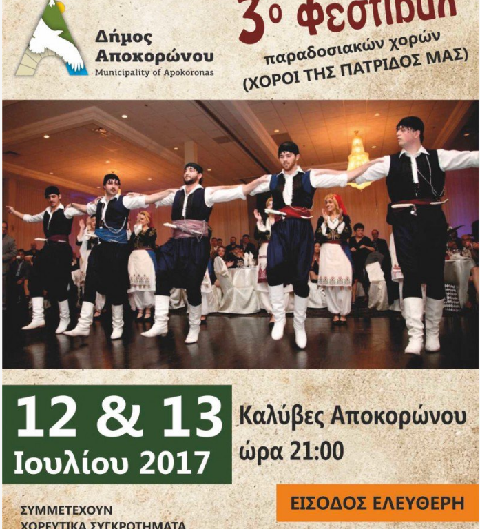 This is a two-day festival organized by the Municipality of Apokoronas with collaboration of dance clubs from all over Greece, within the framework of the CULTURAL SUMMER 2017 events.