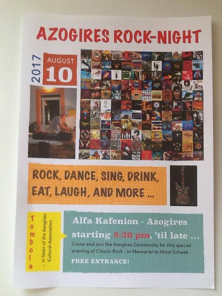 Στης 10 Αύγουστου στον Αζωγυρέ , διοργανώνετε Βράδια με μουσικής Rock εις μνήμην του Συγχωριανού μας Horst Schaab – Κώστας , τα έσοδα θα διατεθούν για τις αυξανόμενες ανάγκες καθαρισμού και συντηρήσεων μνημείων του χωριού μας .