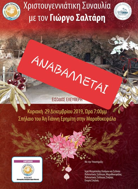 According to an announcement of the municipality of Platanias the Christmas concert which was due to be held last Sunday 27th December at the cave of St John the Hermit at Marathokefala, postponed because of bad weather, will now take place this Sunday, 5th January, at 7.00 pm.