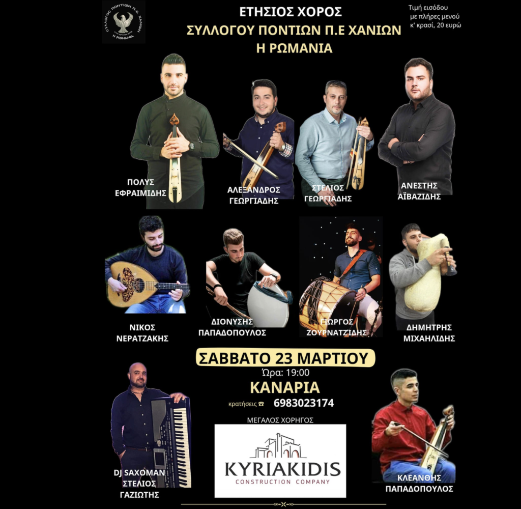 The Pontian Association of Chania, Romania, invites you to their annual Pontian Dance event, which will take place on 23rd March at 19:00 at the Kanaria Event Hall next to the Chania Police Station.
