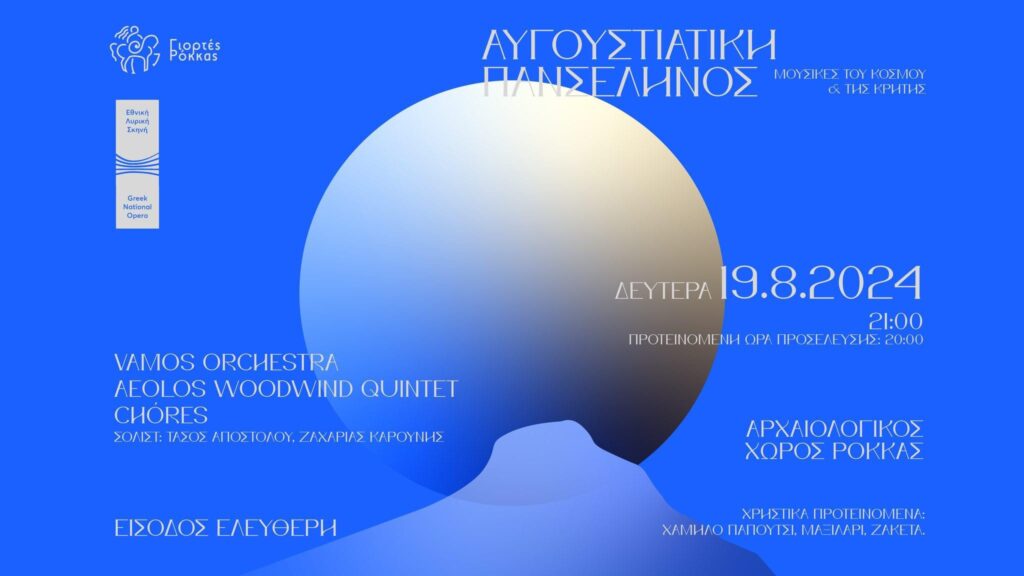 In this year’s event, entitled “Music of the World and Crete in the Full Moon” of the Cultural Associations of Rokka and Kera, also the Vamos Orchestra, the Aeolos Woodwind Quintet and the Chores, with soloists Tassos Apostolou and Zacharias Karounis, are performing.