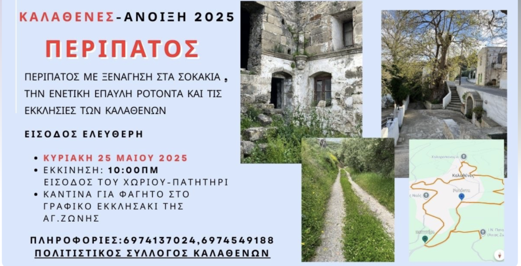 The Cultural Association of Kalathenes organises a guided walk through the alleys, the Venetian Villa Rotonda and the churches of Kalathenes.