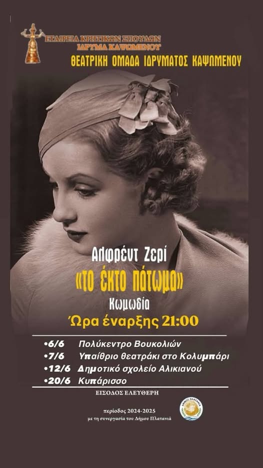 The Municipality of Platanias, in collaboration with the theatrical group of the Kapsomenos Foundation and the support of Cultural Associations and Women’s Associations, presents the comedy “The Sixth Floor” by Alfred Zeri, directed by Nikos M. Kapenekakis