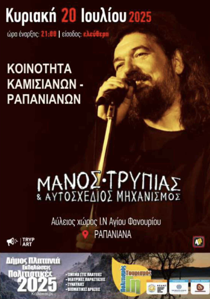 Within the framework of the 2025 Summer Cultural Events of the Municipality of Platanias the Local Community of Kamisiana – Rapaniana invites you to a special musical evening with Manos Tripias & Aftoshedio Mihanismos.