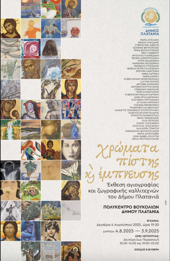 The exhibition brings together works by 39 artists who originate from or reside in the Municipality of Platanias and composes a multi-thematic artistic journey, which combines iconography with contemporary painting.