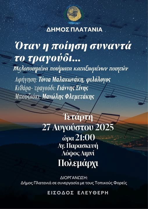 The Municipality of Platanias, in cooperation with local authorities, invites you to a special cultural event entitled: “When poetry meets music…”