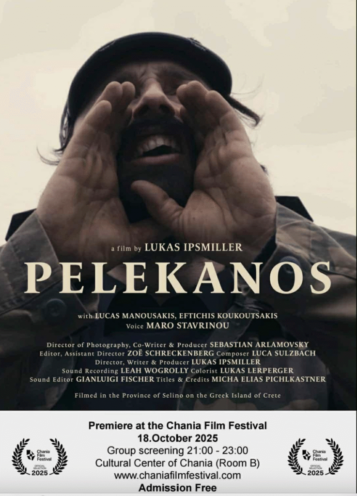 On Saturday, October 18, from 9:00 PM to 11:00 PM, the Chania Film Festival hosts the world premiere of the short film “Pelekanos” by director Lukas Ipsmiller. The screening marks the entry of a new film director onto the Greek film map and illuminates the landscape of southwestern Crete, through a deeply poetic and existential lens.