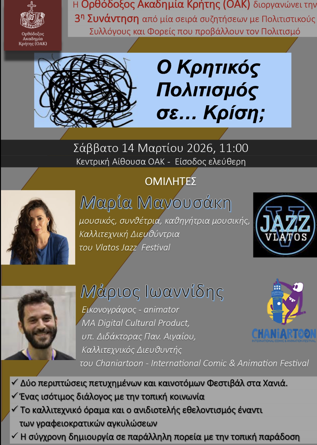 The Orthodox Academy of Crete (OAK) organizes a series of discussions, on the theme “Cretan Culture in… “A crisis?” and also makes an open call to Cultural Associations and every Body promoting the Culture of our country, as well as to any individual interested in being informed.