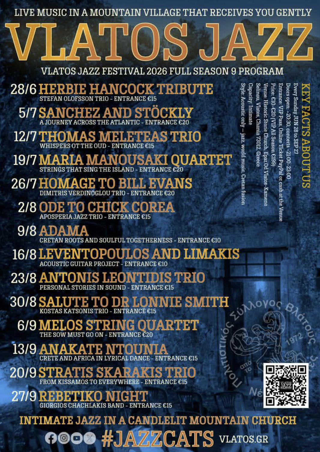Every Sunday evening, the historic stone church of Vlatos comes alive with the warm glow of candles and the intimate sound of live jazz and world music. Join for 14 unforgettable nights of music under the Cretan sky — an experience created for music lovers in western Crete.