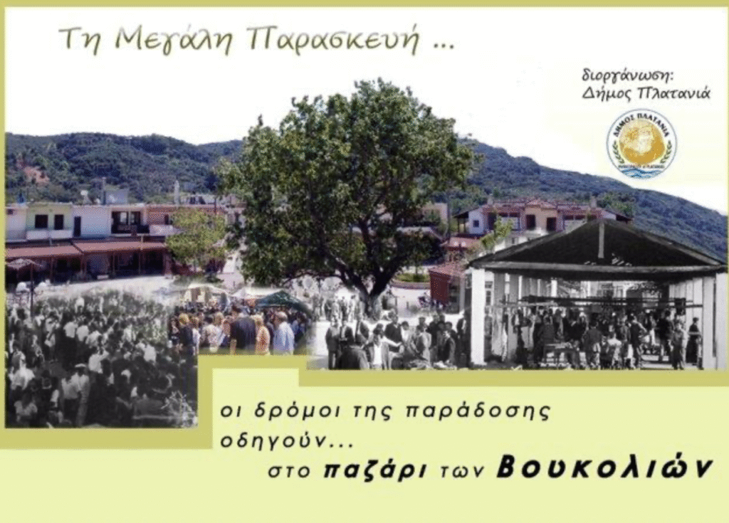 The Municipality of Platanias invites you again this year on Good Friday, April 18, to the established traditional meeting, at the Voukolies Bazaar, in the Municipality of Platanias.
